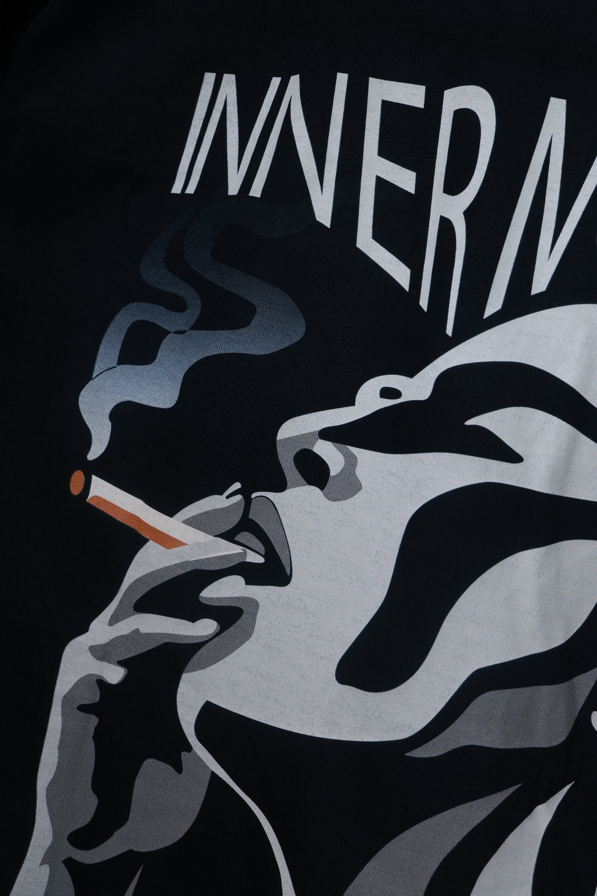 The NOVAE Inner Noise Tee captures the chaos of thoughts that never stay silent. The back artwork features a striking illustration of a figure exhaling smoke — symbolizing the release of thoughts, pressure, and emotions trapped inside the mind.